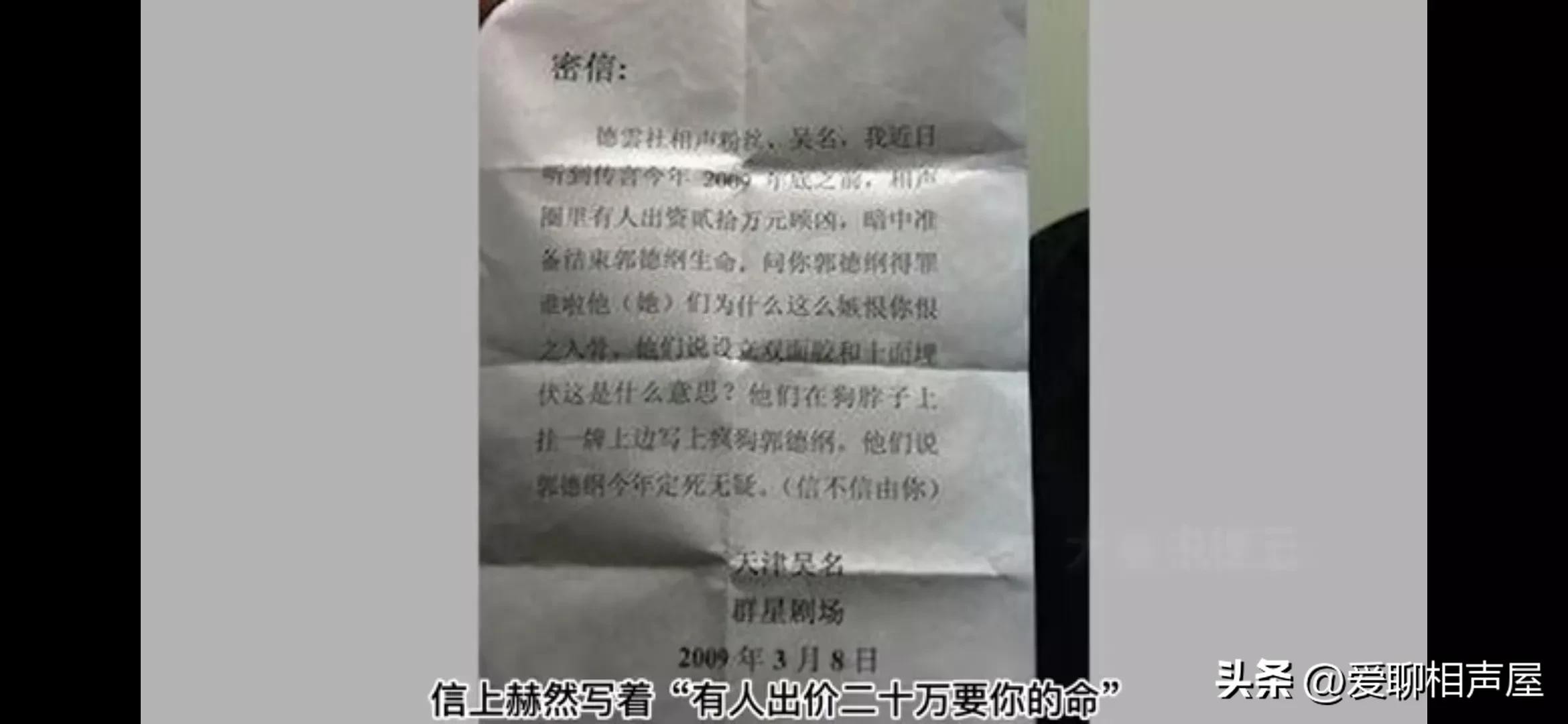 而当郭德纲打开信封的时候,赫然在目的是一名叫吴名的天津人,说是自己收了相声界集资的二十万,说好了今年要你的命。