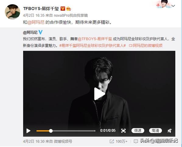 近日,阿玛尼官方宣布易烊千玺成为其全球彩妆及护肤代言人。随后易烊千玺也转发了该条微博动态,并期待未来能有更多的精彩合作。