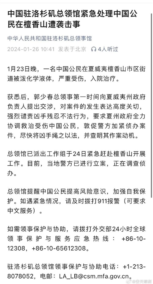 随后,中国驻洛杉矶总领馆派出工作组紧急赶赴檀香山开展工作。26日,据美中人民友好协会檀香山分会会长透露,受害者已恢复意识,夏威夷华人组织正为其筹集资金。另据知情人士称,受害者为北京外国语大学毕业生。