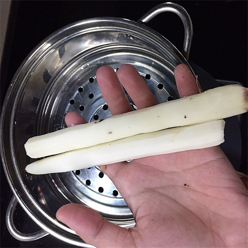 接下来将山药放凉,拿出来削皮,亦或是轻轻一剥落表皮,就很容易脱落了;看,现在徒手给山药削皮都不怕。因为蒸熟后,山药表面的过敏源被破坏后,就不用担心会对手部造成刺激了。