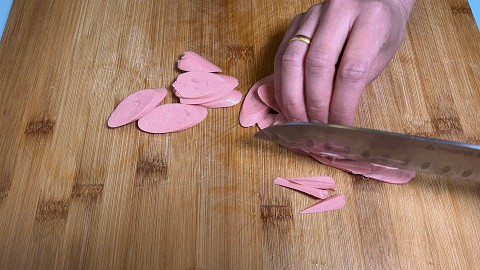 2. 火腿肠一根,撕去外皮,先切成薄片,再切成火腿肠丝备用