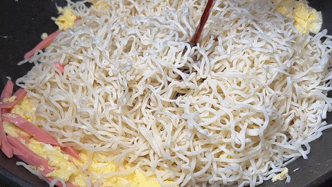 材料: 炒面 韭菜 鸡蛋 火腿肠