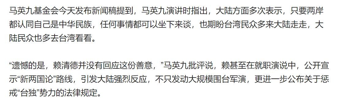 马英九此前就表示:“台岛不该是棋子,两岸的发展未来应该由两岸人民自己去决定,民进党当局应该认清现实,世界上没有其他国家会为了你们去牺牲他们的战士,两岸一旦发生战火,死伤的都是中国人,两岸问题更该由自己去解决,不该留下外国介入的空间。”