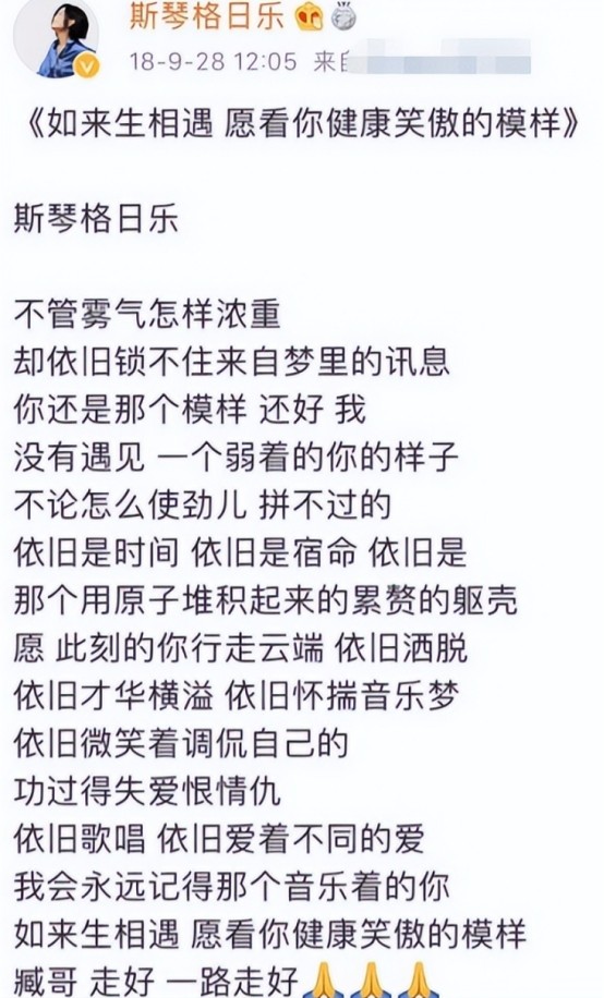 2018年9月28日,得知臧天朔去世,斯琴格日乐写了一首诗,情真意切、感人肺腑,令人动容。