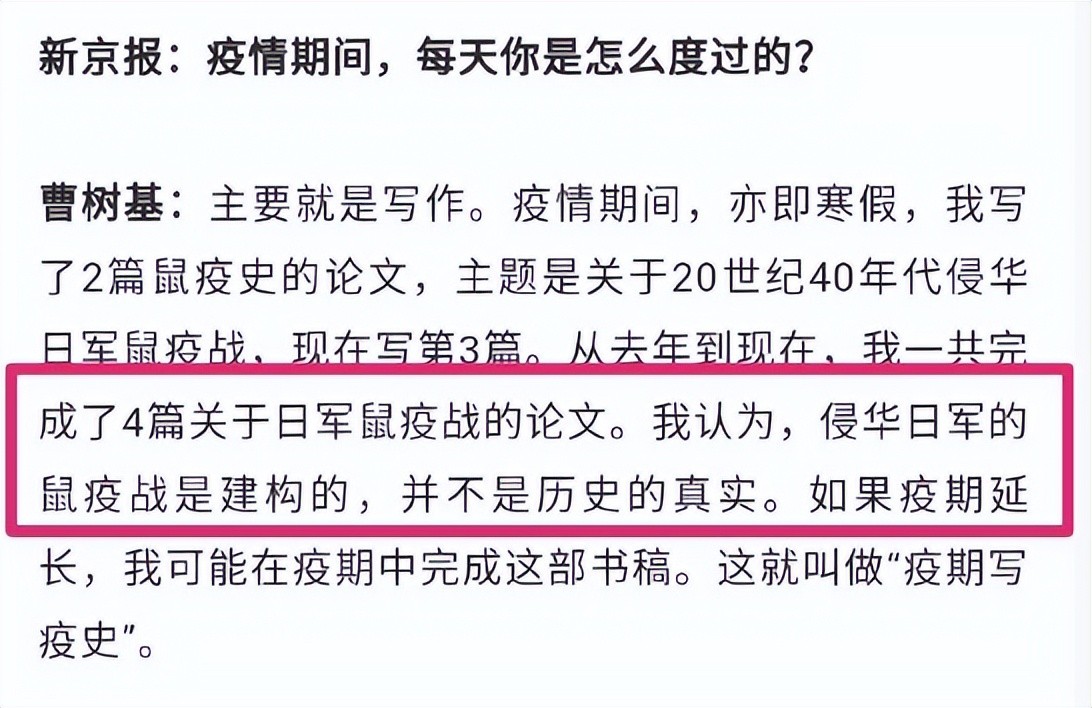 2020年,《新京报》记者对曹树基进行了一次专访,原本是希望借助这位特聘教授的专业知识,向公众科普防疫措施,以及如何保障生活物资供应。然而,出乎所有人意料的是,他不仅没有提供任何实用建议,反而公然否认日军细菌战的历史。
