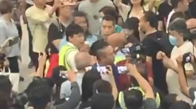 据港媒报道,当日傍晚6时许,该男子与现场的黑衣人发生冲突,现场一度混乱。梁先生表示,与黑衣人争执期间,被一名男子打中左眼,他已经报警。随后,梁先生被约十名机场保安护送离开,护送时保安围成一圈,拉手将他圈在圈内。