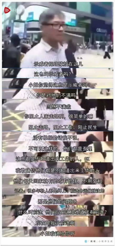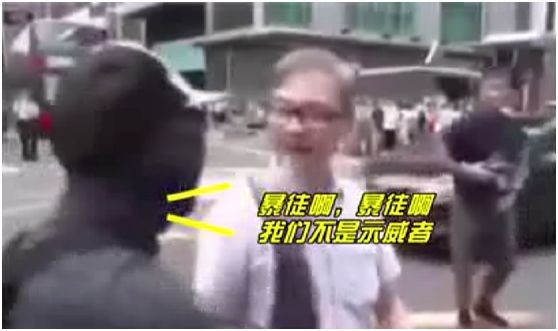 需要划重点的在片尾。黑衣人一度围住老人咒骂,态度嚣张。眼看说不过老人,其中一名黑衣人直接来了句:“暴徒啊、暴徒啊,我们不是示威者!”