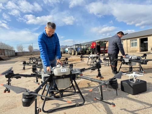 石楼镇现代农业产业园工作人员正在检修无人机。