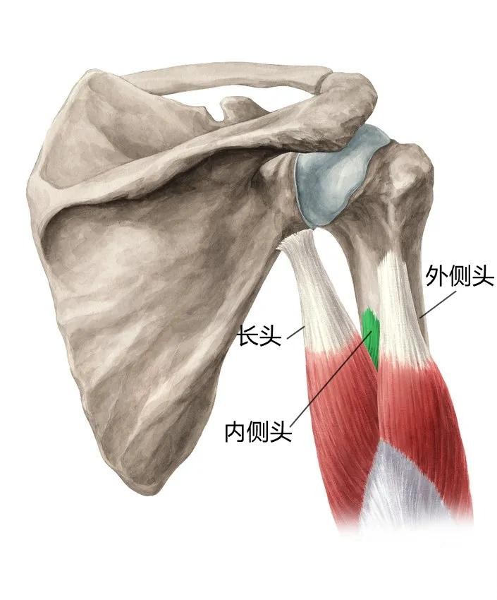 肱三头肌由三个头构成,分别是内侧头、外侧头、长头。外侧头和长头位置表浅,而内侧头则位于它们的深面。