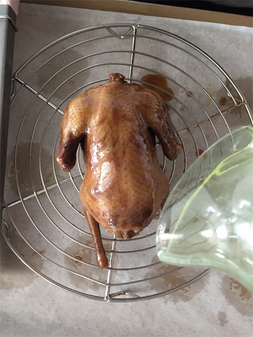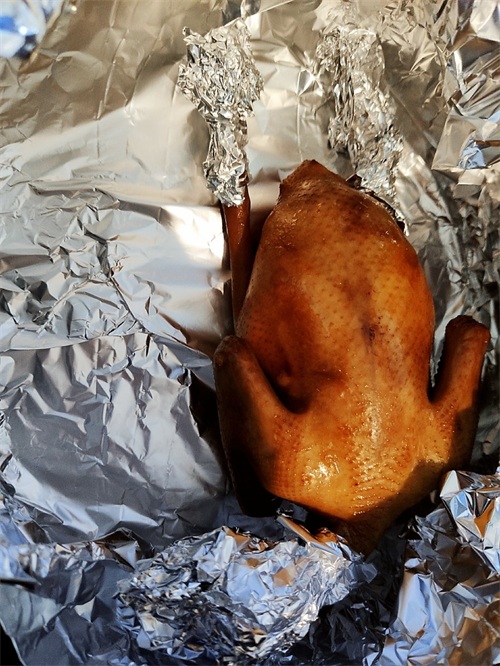 8. 最后用锡纸包裹住易糊的位置,爪子和颈部,烤箱180度预热五分钟后,上下火用180度烤20分钟,如果烤完后还不够脆,翻面再继续烤5分钟即可。
