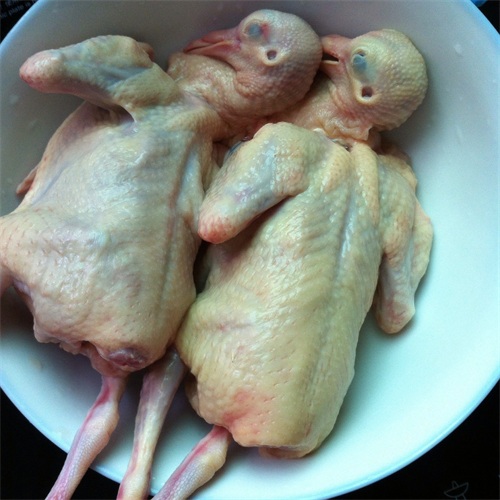1. 乳鸽洗净,肚子里掏干净,切去头和脖子。