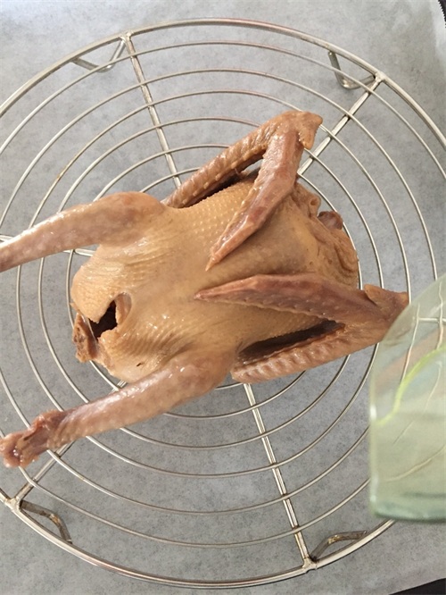 6. 冷藏晾干的乳鸽表面还是会有些水汽,取出用吹风机吹干。