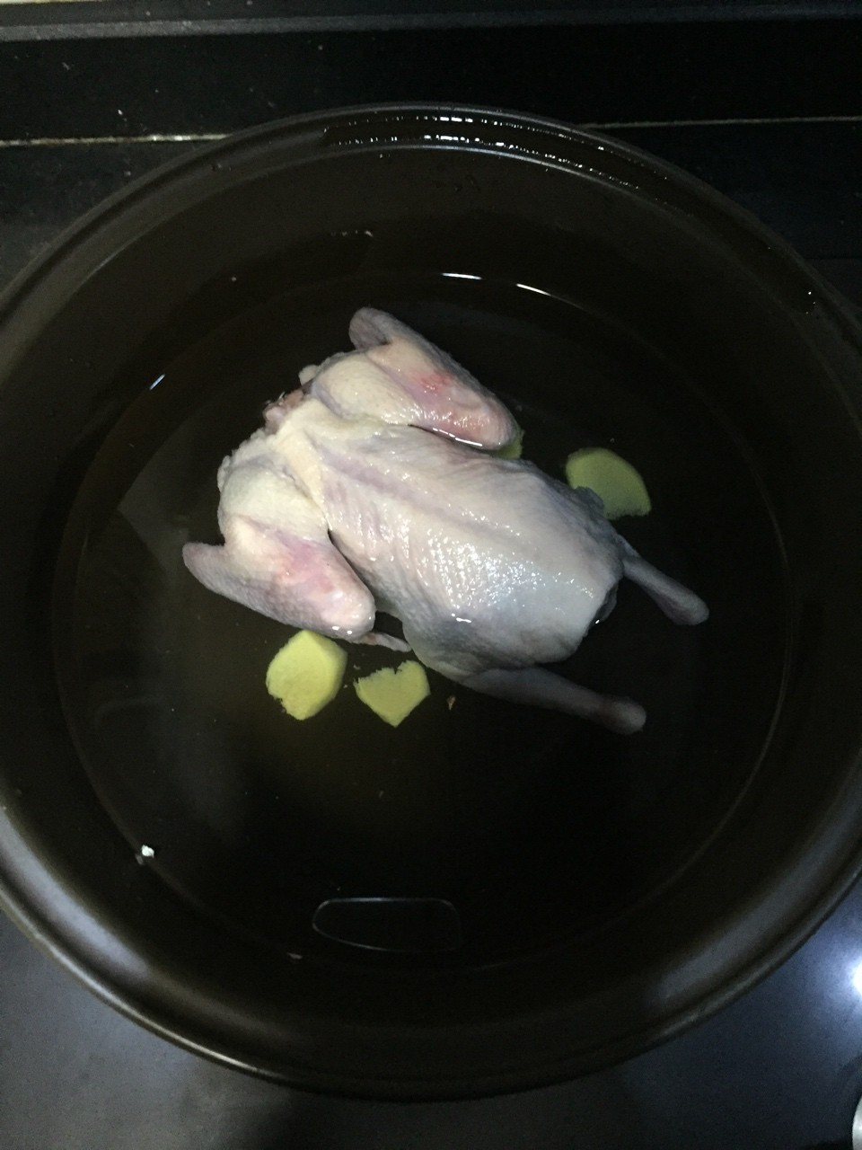 2. 将乳鸽冷水下锅,放人葱姜焯水,水开即可捞出。