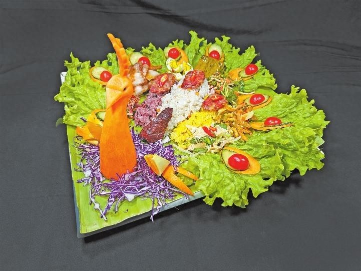 芒市被誉为“美食的天堂”。孔雀宴是德宏傣族景颇族自治州的民族宴席,栩栩如生的“孔雀头”与具有浓郁少数民族特色的风味菜品依次陈列,仿佛孔雀开屏。孔雀宴的“尾巴”,分别由代表德宏州5个世居少数民族傣族、景颇族、德昂族、傈僳族、阿昌族的菜品组成,包括香草排骨、烤鱼、烤五花肉、景颇鬼鸡、景颇舂干巴、包烧肉等,表达了人们对幸福生活、民族团结的追求,具有鲜明的地域特色。
