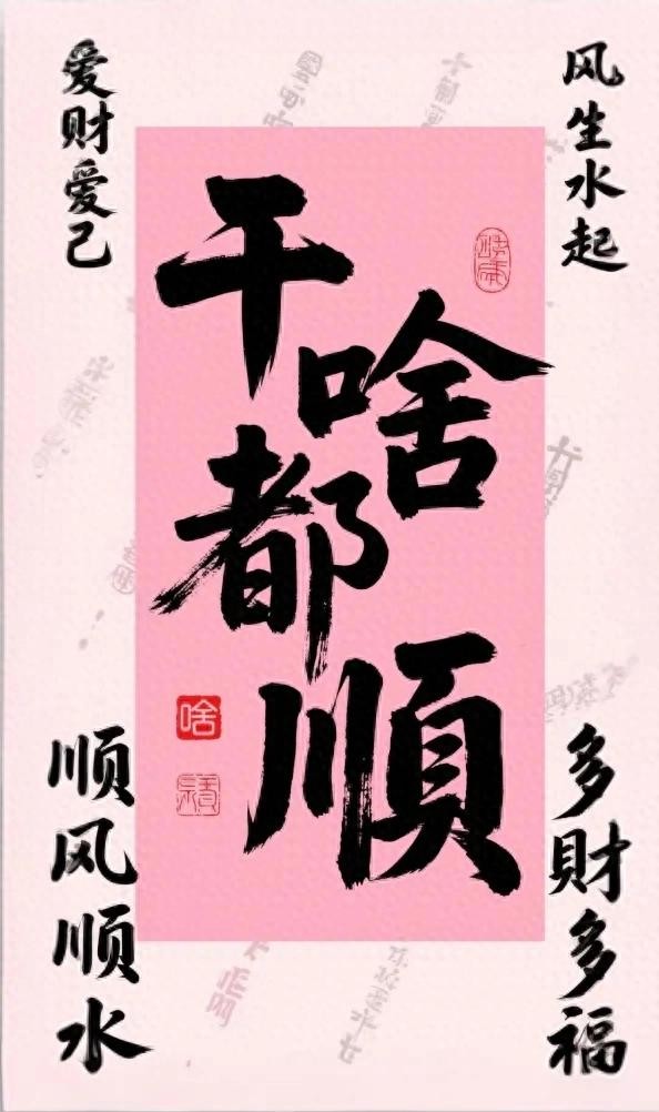 这些文字同样是用黑色毛笔书写,与中央的大字风格相呼应,尽显传统韵味。而 “啥” 字和 “顺” 字下方的红色印章图案,更是画龙点睛之笔,为整个画面增添了浓浓的中国风。