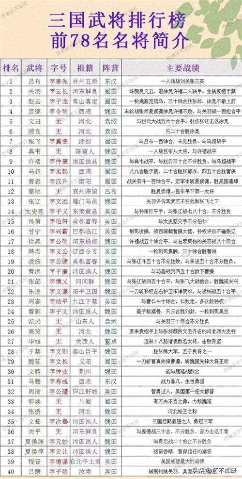 三国武将排行榜,三国前七十八名武将排行一览