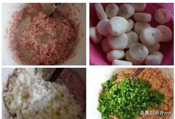 馅料配比:猪肉300克、马蹄适量、葱30克、生姜一小块、白胡椒粉一小勺、盐适量、白糖半小勺、鸡精半小勺、芝麻油半汤勺;