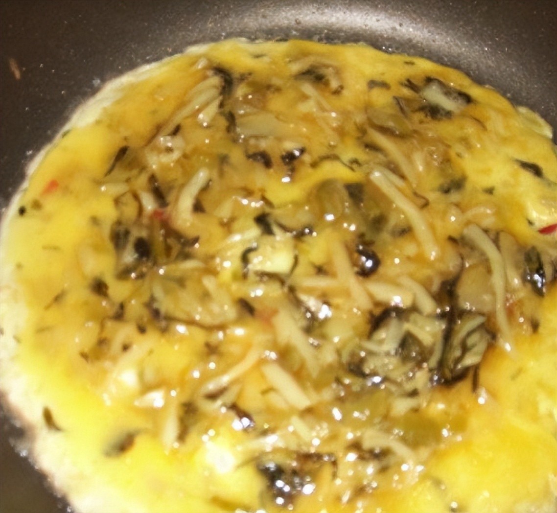 8. 等鸡蛋开始凝固后,用筷子搅拌均匀,再次平铺。