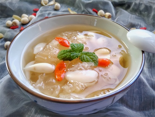 (7) 可以将糖水倒入碗中,也可以加入一些冰块,制作成春笋莲子冰糖水,更加清爽。