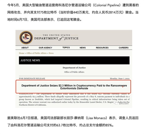 2021年6月7日,美国联邦调查局竟然追回了Colonial公司被黑客勒索的比特币。在比特币的设计逻辑上,这种事情是不可能做到的,所以这件事也导致比特币的信用崩塌。但是,至今美国联邦调查局都没有公布是如何破解黑客的比特币钱包密码的。
