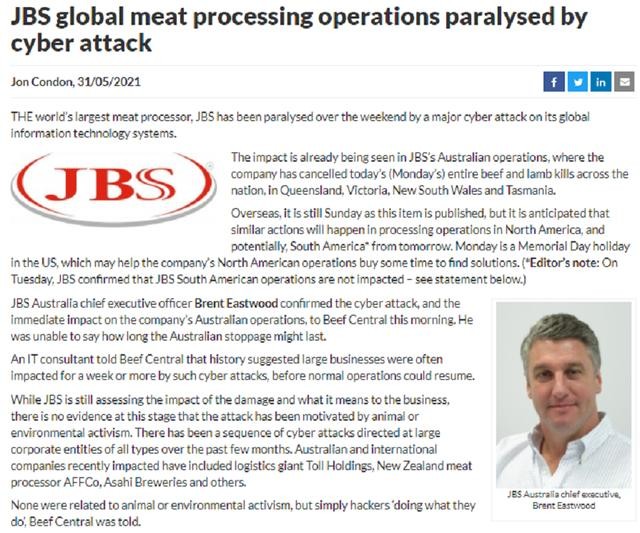 比如在2021年6月9日,全球最大的肉类供应商JBS的网站因为遭受黑客攻击,被迫向对方支付了价值一千一百万美元的比特币赎金。