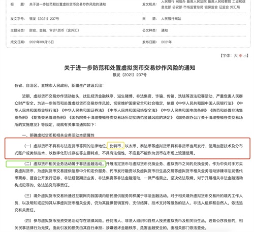2021年9月24日,中国人民银行发布通知:表示比特币不具有法偿性,不能作为货币在市场上流通。并明确虚拟货币相关业务活动属于非法金融活动。