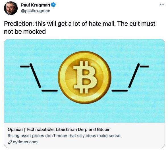 2021年5月,诺贝尔经济学奖得主保罗·克鲁格曼在《纽约时报》发表文章说:“比特币就是一场赤裸裸的庞氏骗局。”