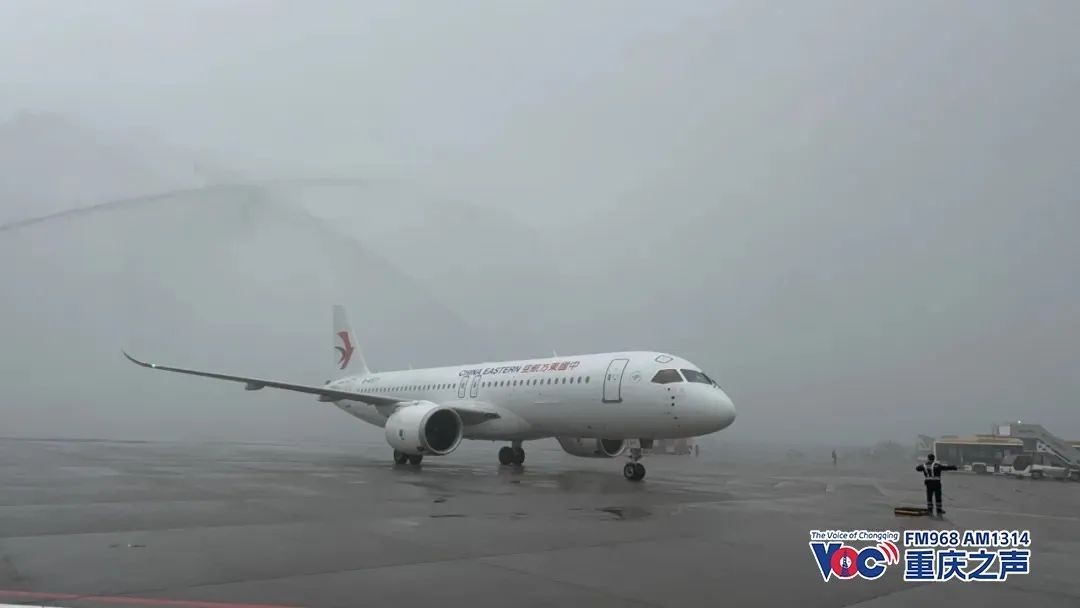 东航C919从上海虹桥机场飞抵重庆江北国际机场,航班号MU5421/5428,上海至重庆08:05-10:55,重庆至上海12:50-14:55。