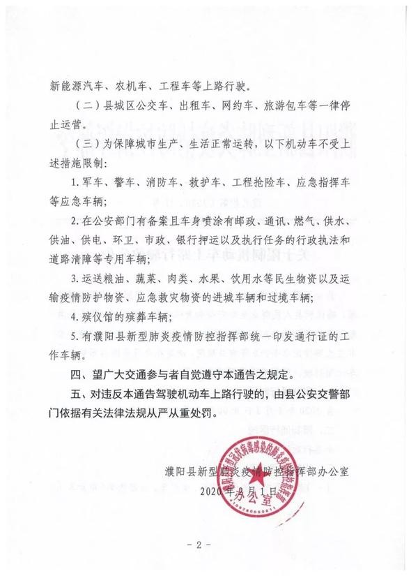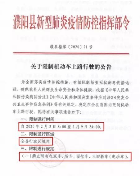 关于濮阳县限制机动车上路行驶的通告自2020年2月2日8:00至2月9日24:00全县行政区域内限制通行