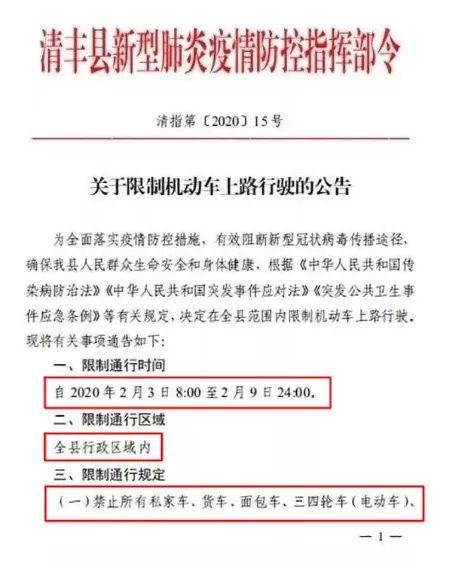 关于清丰县限制机动车上路行驶的通告自2020年2月3日8:00至2月9日24:00全县行政区域内限制通行