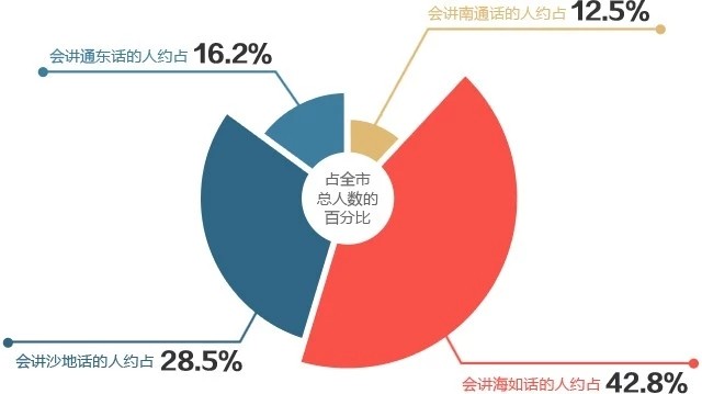 经调查,目前在南通家庭中,南通方言和普通话共用的约占40%,以南通方言为主的只占45%。南通方言在90后、00后中已经出现严重的断层现象。中小学生中,能说流利说南通方言的不足30%,不能说的高达70%以上。在幼儿园中,不会讲和听不懂的幼儿比例高达90%以上。