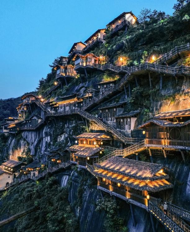 悬崖峭壁上亭台楼阁很震撼