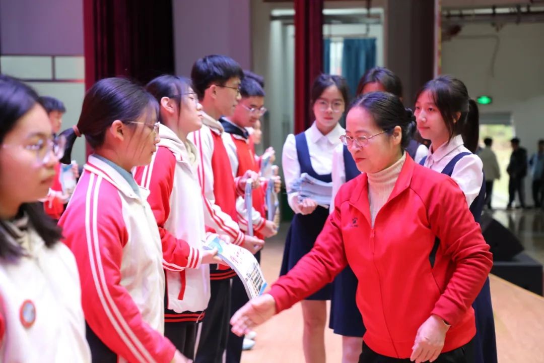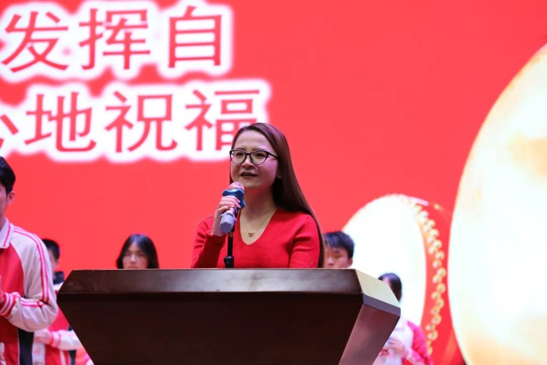 高三年级家委主任梁璐莎女士作为家长代表上台发言。她告诉在场的同学们,父母永远是最坚强的后盾,家长们将为大家百日的冲刺保驾护航!随后,各班家长代表也依次上台,为各班的学子们献上高考祝福卷轴。家长亲切的话语、诚挚的祝福,为高三级的高考备考增添了更多的信心和动力。