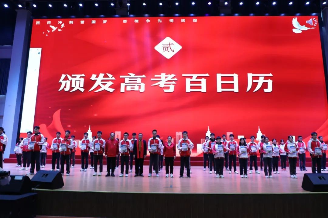 倒计时100天的日历已经掀开,加速前进的嘹亮号已经吹响!黄显连、莫熙朝、杨耀邦等领导为各班颁发“高考百日历”,共同期望着同学们珍惜这100天,为高考而战斗,成功跨越最后的征程。