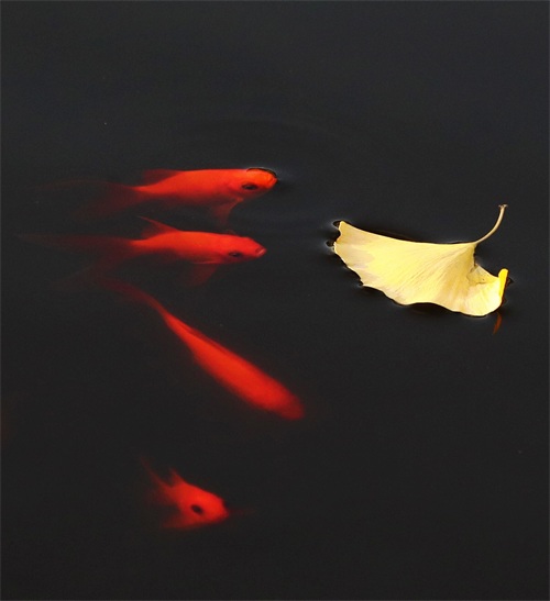 10月27日,在山东省滕州市西岗镇,一群锦鲤在银杏叶边游弋。 新华社发(李志军摄)