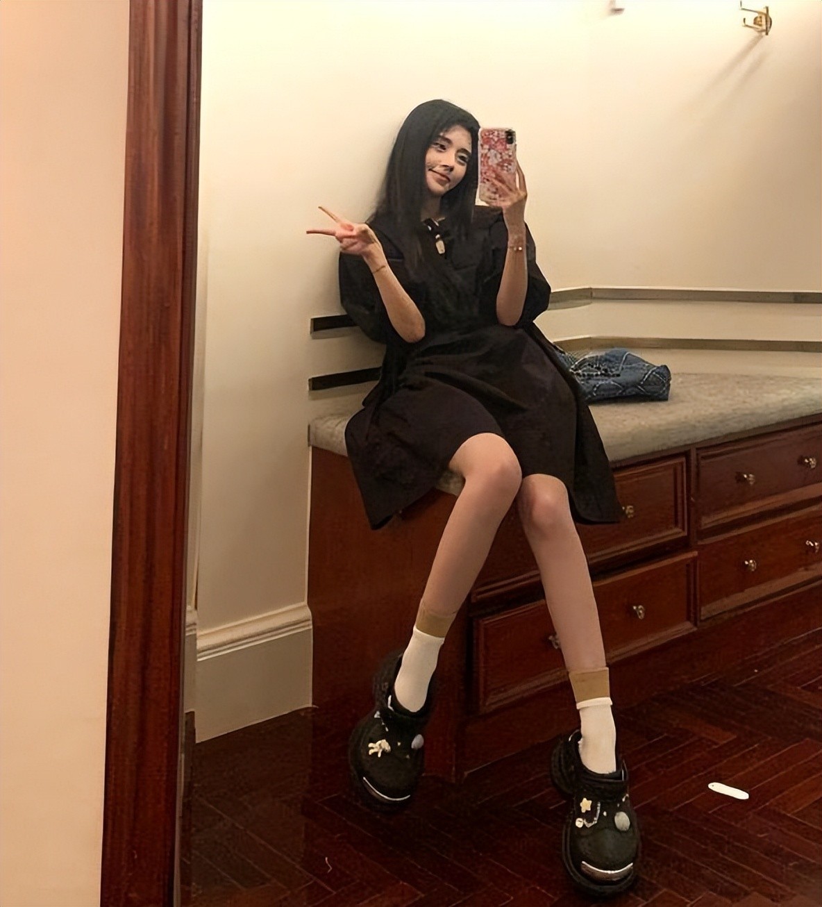 在这组照片中,鞠婧祎穿着一件黑色的连衣短裙,展现出优雅大方的姿态。她拥有乌黑柔顺的长发,随风飘动,格外吸引人。她微微歪头,露出甜美的微笑,那双明亮的大眼睛闪烁着星光的模样,更是让人赞叹不已。她高挺的鼻梁和精致的下颚线条使她的五官立体而完美。她的皮肤白皙如雪,宛如瓷器般细腻,让人不禁赞叹她的天生美丽。