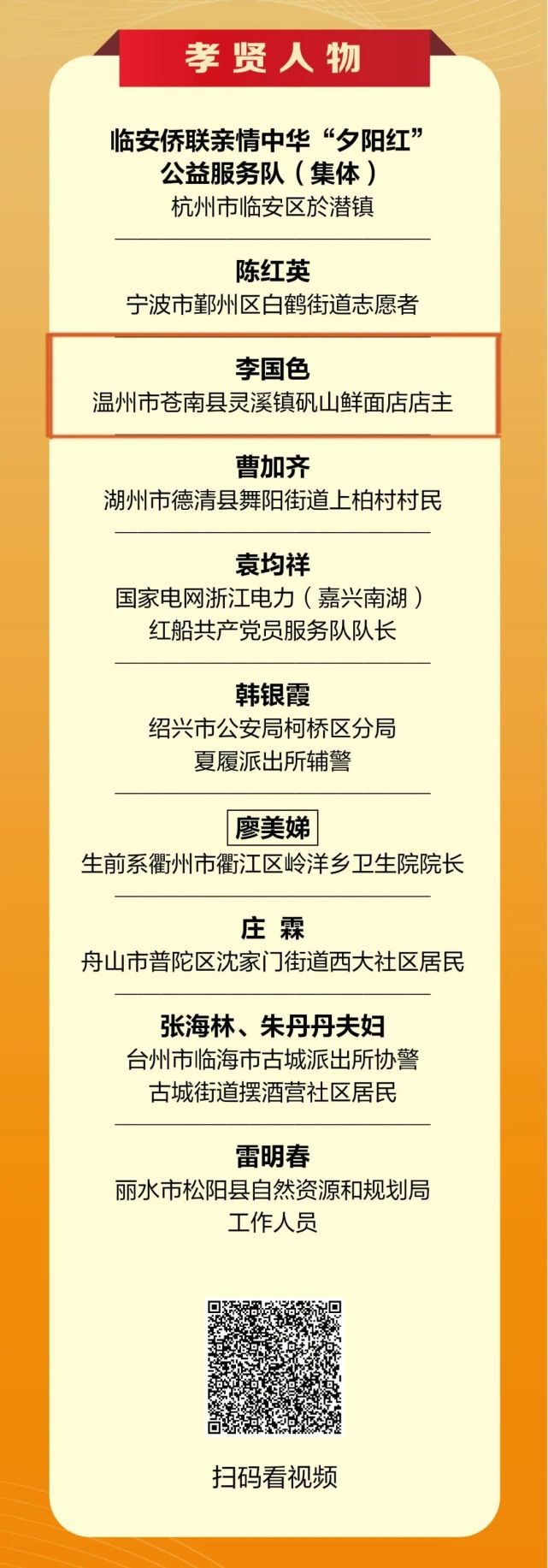 12月1日,第十一届“浙江孝贤”揭晓,10位孝贤人物、10个慈孝之乡、10家慈孝企业荣获表彰。其中,苍南灵溪镇塘北路矾山鲜面店店主李国色入选孝贤人物。