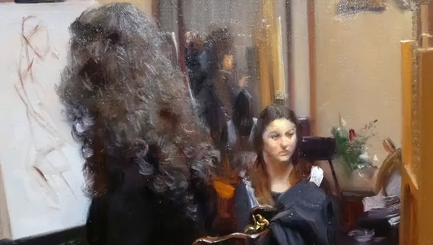 调用各种手段如:吹风机、高倍放大镜、反光片,投影、实物写生时对应的高清晰照片、电脑显示器、实物、还有冷军自制的特殊油画工具、特殊油画底子、特定的画室环境光线等等,能够一天九个小时,连续四个月完成一幅作品。