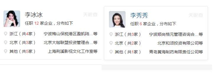 据天眼查数据,目前李冰冰任职企业有12家,李雪任职企业有6家。