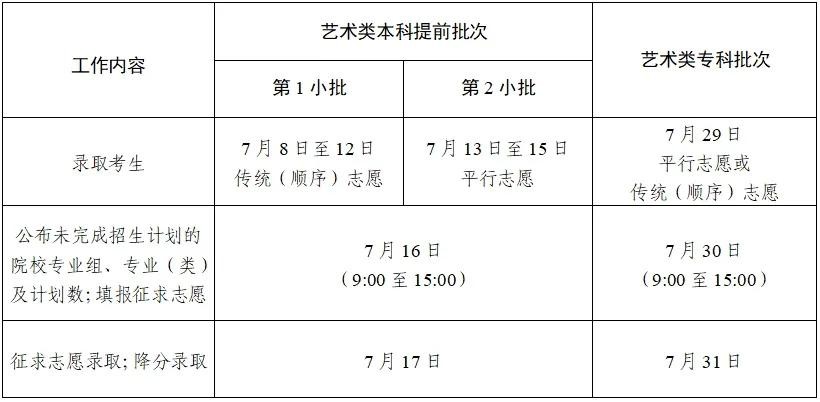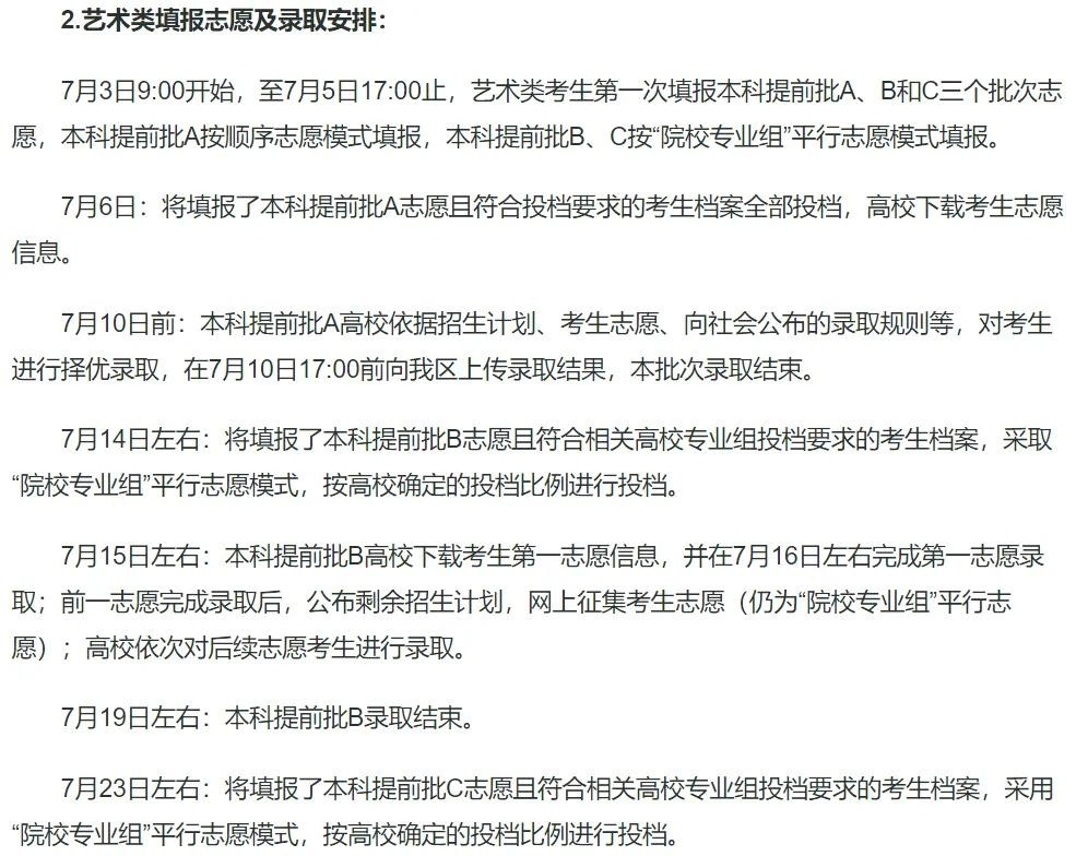 6月29日8:30—6月30日17:30符合要求考生填报艺术类校考批、统考批第一段平行投档志愿。