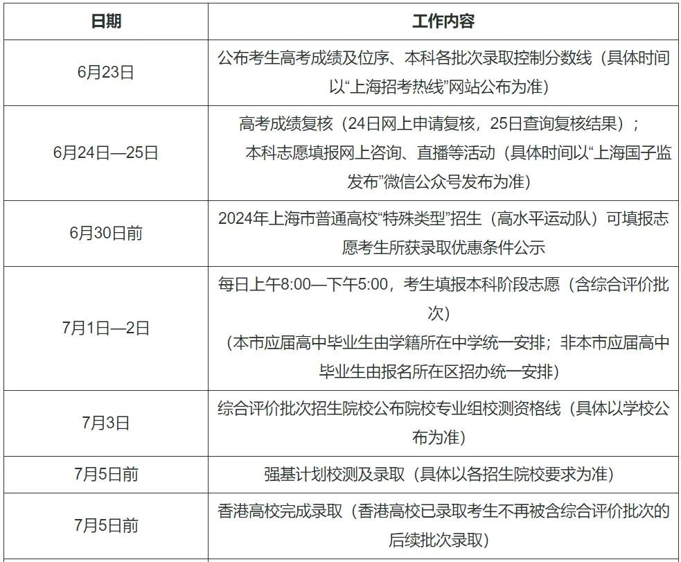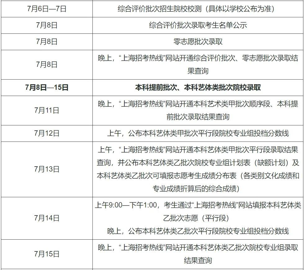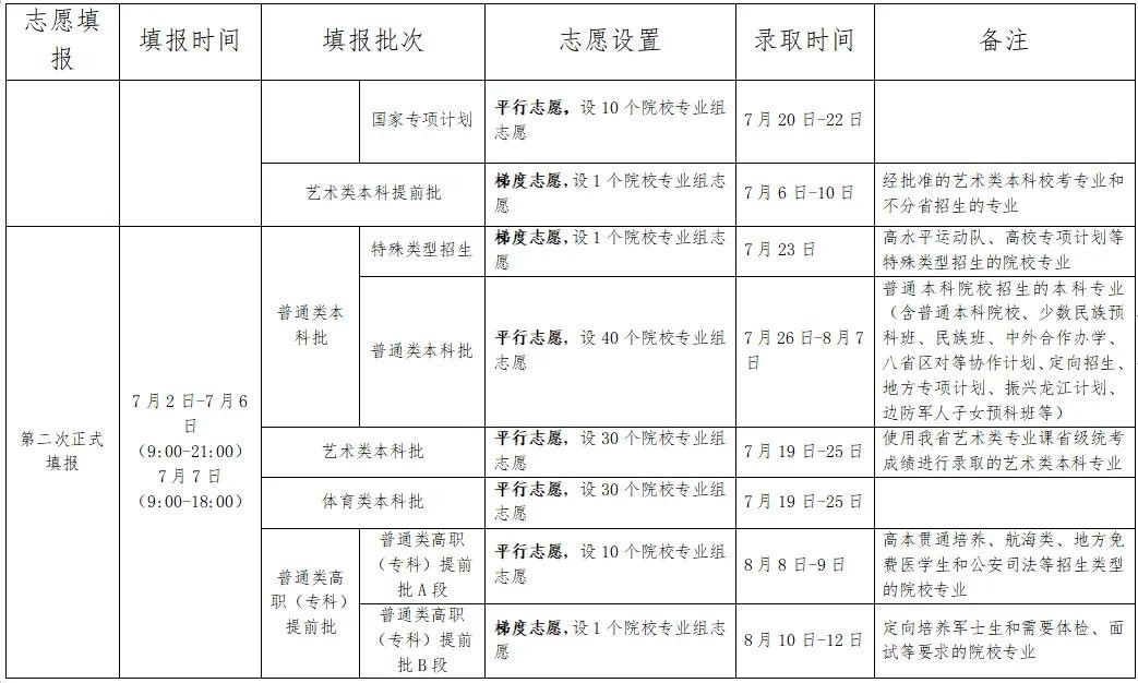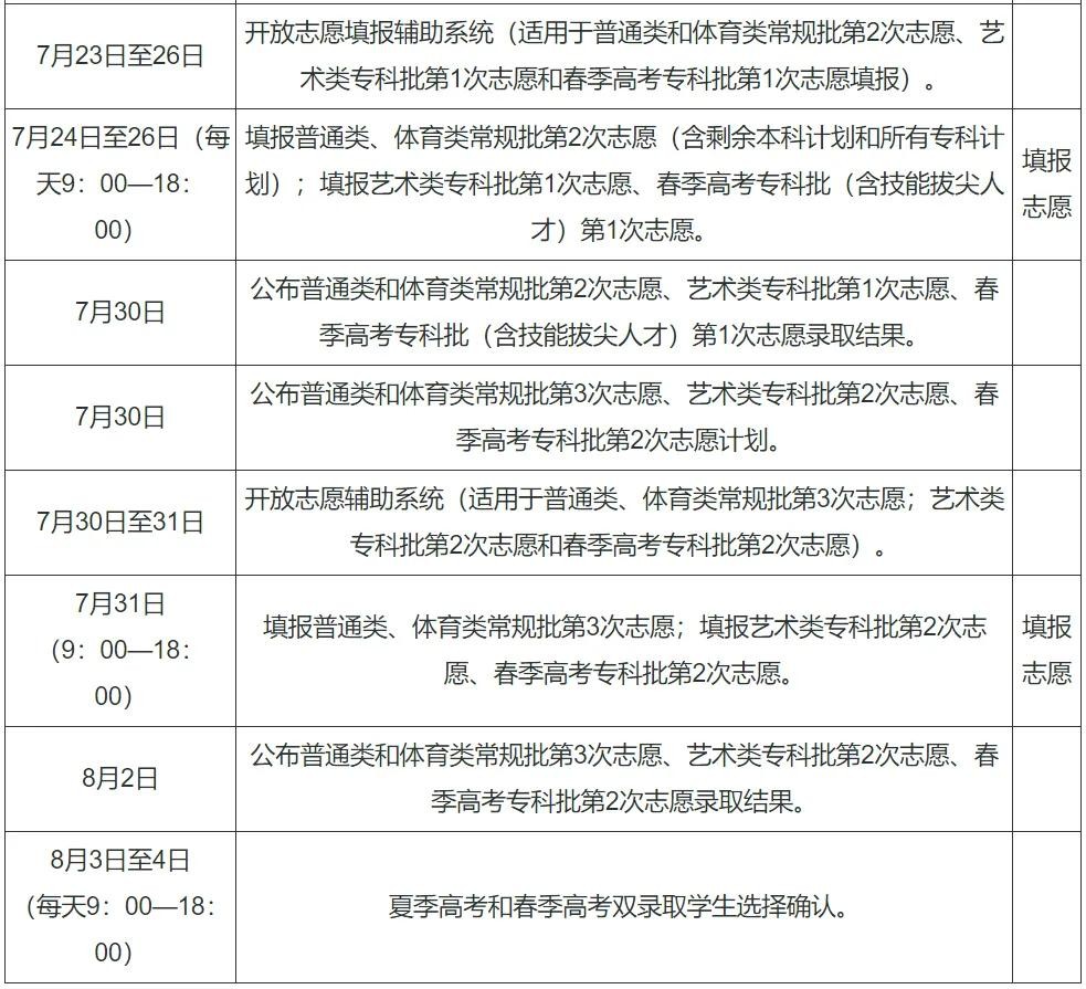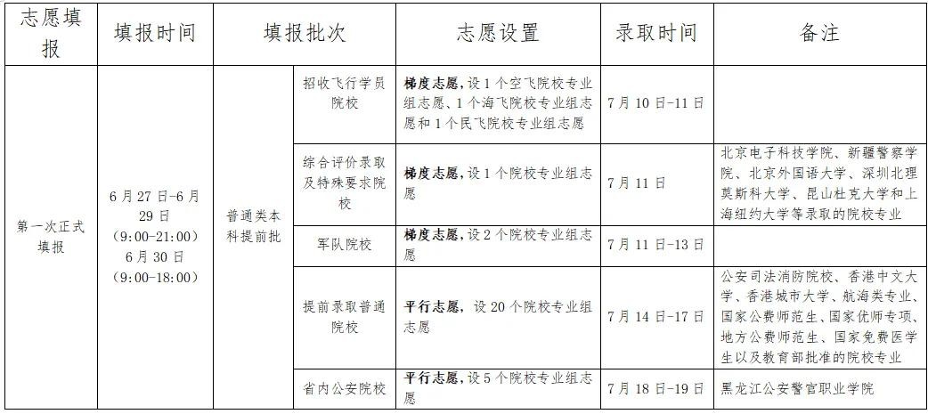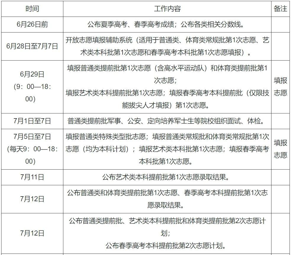 6月29日8:30—6月30日17:30 符合要求考生填报提前录取院校、第一段平行录取、高校专项计划、高水平运动队、地方专项计划、浙江警察学院三位一体招生志愿。