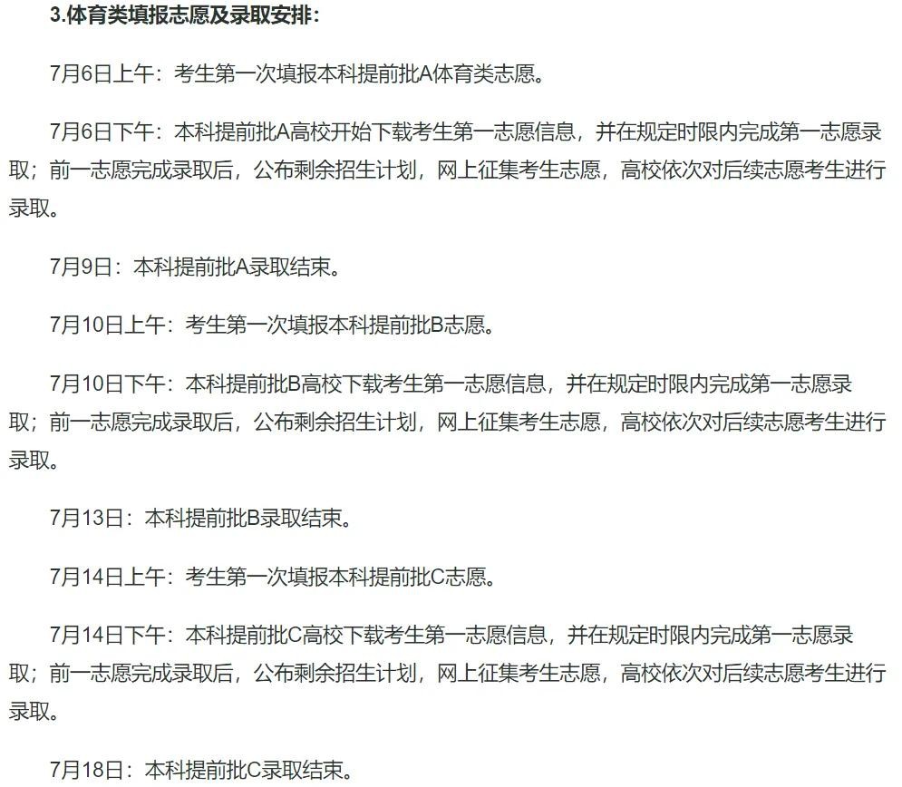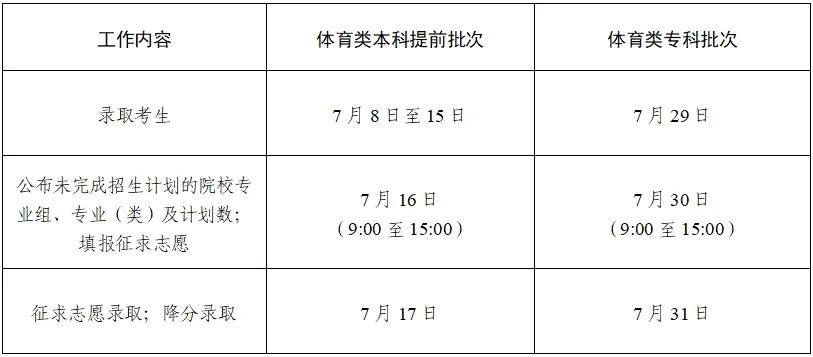 6月29日8:30—6月30日17:30符合要求考生填报体育类提前录取院校、体育类第一段平行投档、特招生院校志愿。