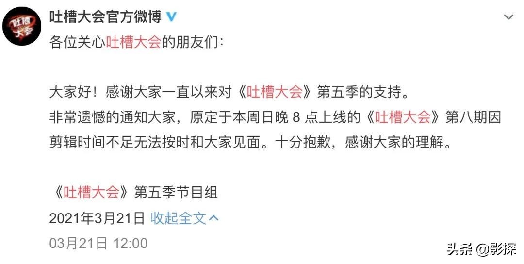 终于,周日没有等来节目,等来延播的通知。