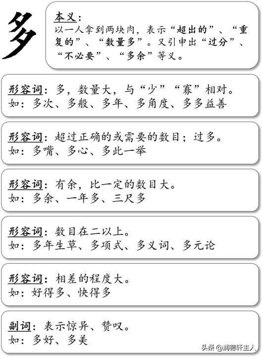 综上所述,“多”字本义:以一人拿到两块肉(别人只分到一块),表示“超出的”、“重复的”、“数量多”。又引申出“过分的”、“不必要的”、“多余的”等含义。