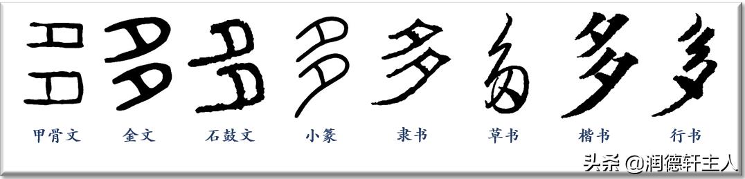 两“夕”相叠的“多”误导了未见过甲骨文的许慎,他在《说文》中解释:“多,重也。从重夕。夕者,相绎也,故为多。重夕为多,重日为曡。”从甲金文来看,这种解释显为谬误。