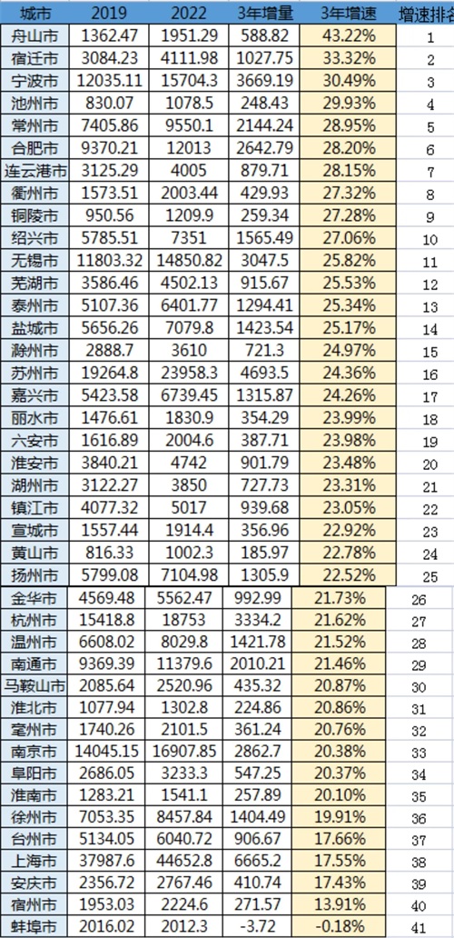 而且按照舟山目前的投资强度,舟山大概率未来5年依然会保持翻番的增长态势;排名第二的是宿迁,3年时间增长了1/3,如果说别人是失去的3年,宿迁则是跑步前进的3年;排名第三的是宁波,宁波作为一个万亿经济体量的城市,3年增长了30.49%,可以说是闷声发大财的典型。