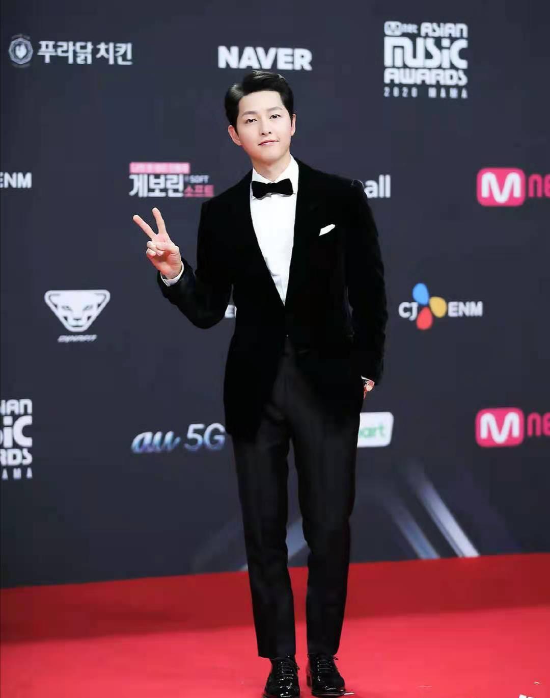不过宋仲基还是有心了,没有选择黑色西装,选择了一款深蓝色系的西装,还是灯芯绒的面料,所以看上去质感还是挺强的,灯芯绒这种面料看上去也不会特别单薄,还挺有冬日氛围感的,所以整体造型看着还是挺成熟稳重的,儒雅中又透露着一股绅士感,感觉黑色的肤色也给人一种成熟的感觉,果然要想打造硬汉感,第一步还是得着摆脱白皮,这样看看就会更有范儿。