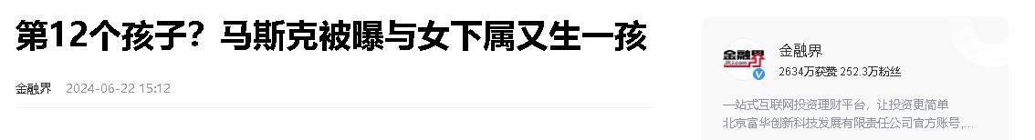 金融界:第12个孩子?马斯克被曝与女下属又生一孩
