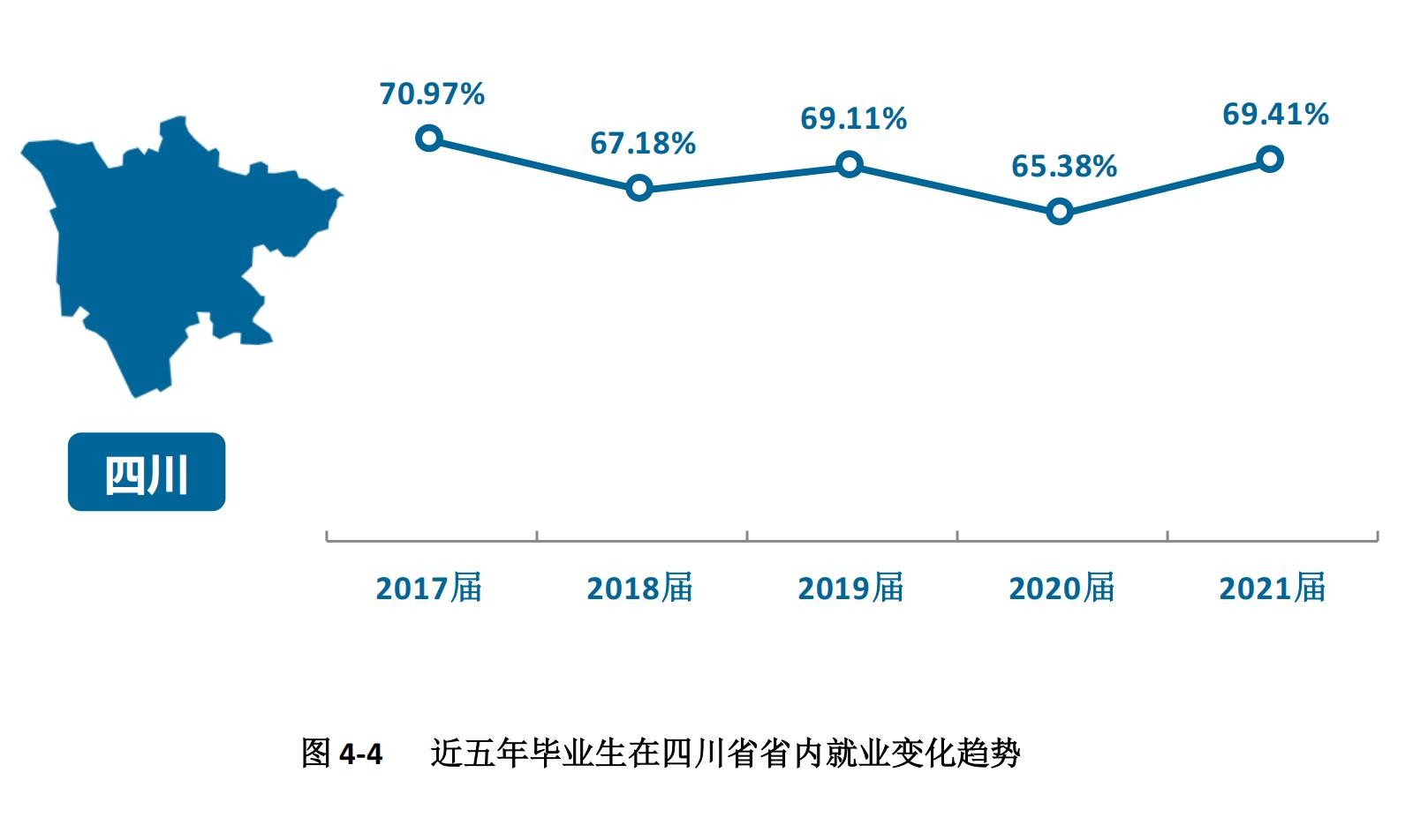 三是四川是就业主战场,到发达地区的也不少。作为一所四川省当地高校,四川自然是该校 2021 届毕业生就业主战场,占比 69.41%;其中,本科生毕业生四川省省内就业占比 69.43%,研究生毕业生四川省省内就业占比 69.27%。省外就业主要流向了广东省、重庆市、北京市等;本科生在省外就业地区主要为广东(4.58%)、重庆(4.01%)、北京(2.35%)、湖南(1.81%)、河南(1.61%)、浙江(1.59%),研究生在省外就业地区主要为重庆(5.52%)、广东(3.37%)、北京(2.15%)、河南(2.08%)。其实,近五年的情况大概都是这样,大家可以看看近五年在四川本省就业的比例变化趋势。