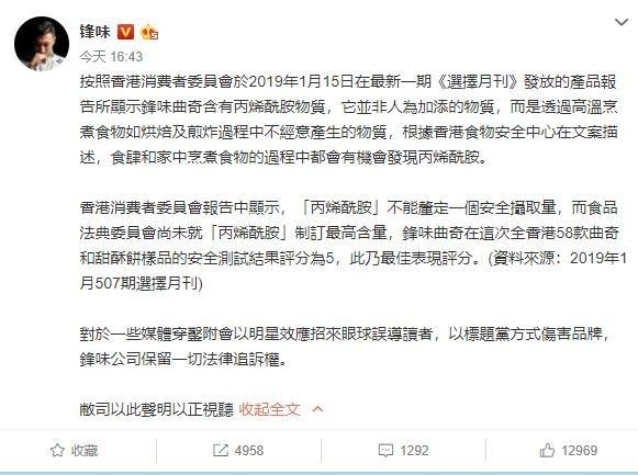 1月16日下午,针对旗下曲奇致癌这件事,谢霆锋方面发表声明称曲奇并不会致癌,而这种被检测出来的叫做丙烯酰胺的物质在家庭烹饪中都是有可能会出现的。并表示一些媒体误导读者,必要的话会用法律手段说话。